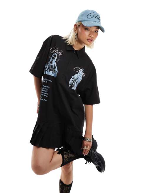 COLLUSION - Vestito camicia corto stile kilt nero con stampa sul davanti