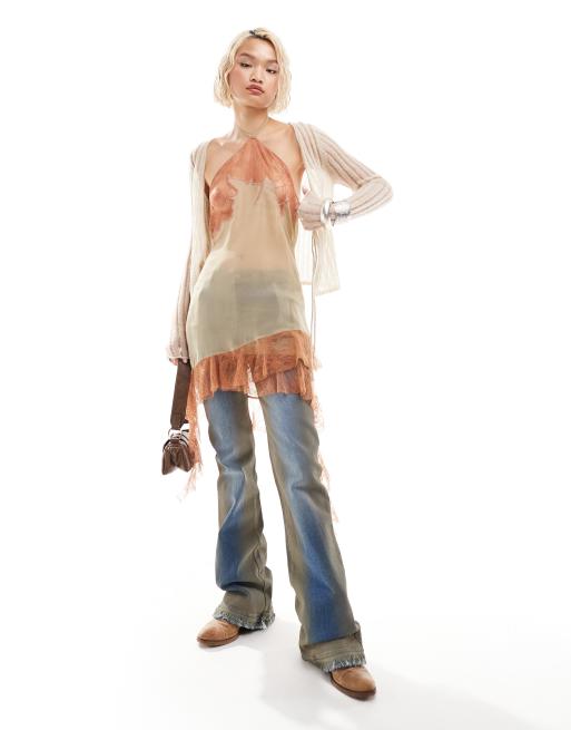 COLLUSION - Vestito corto da festival allacciato al collo tonalità neutra in chiffon e pizzo trasparente con fondo asimmetrico