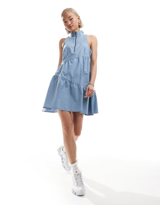 COLLUSION - Vestito grembiule corto asimmetrico in cotone blu con zip