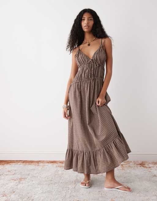 COLLUSION - Vestito lungo con spalline sottili marrone a quadri