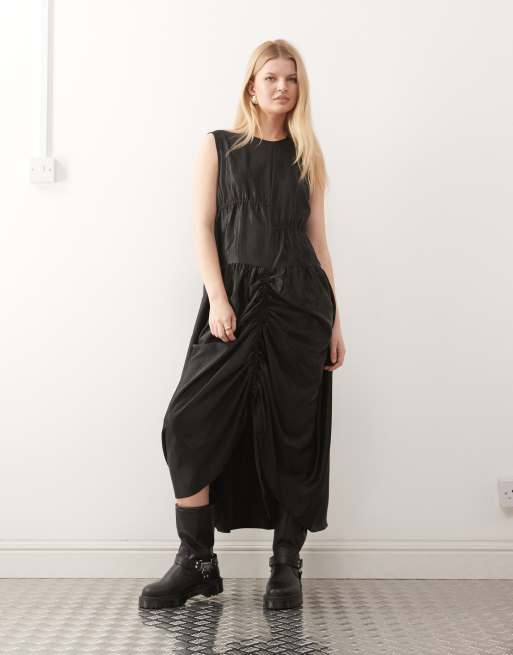 COLLUSION - Vestito lungo in raso nero con coulisse multiple