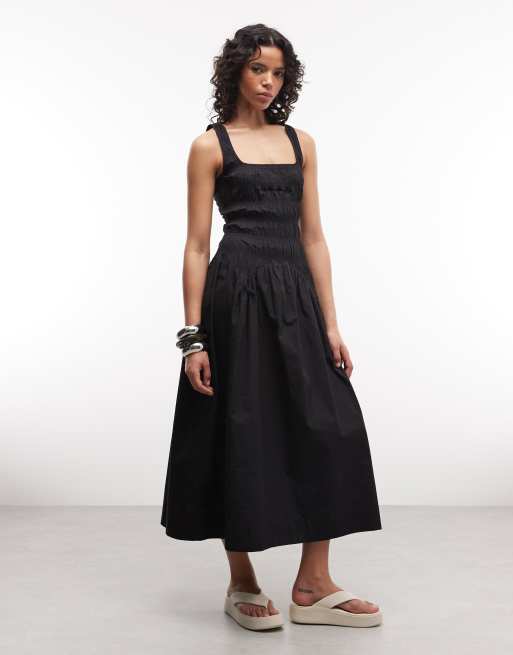 COLLUSION - Vestito midi arricciato con scollo squadrato nero