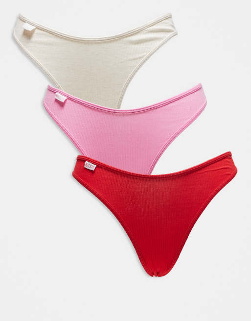 Cotton On - Confezione da 3 slip alla brasiliana in cotone a coste color rosso, rosa e marrone