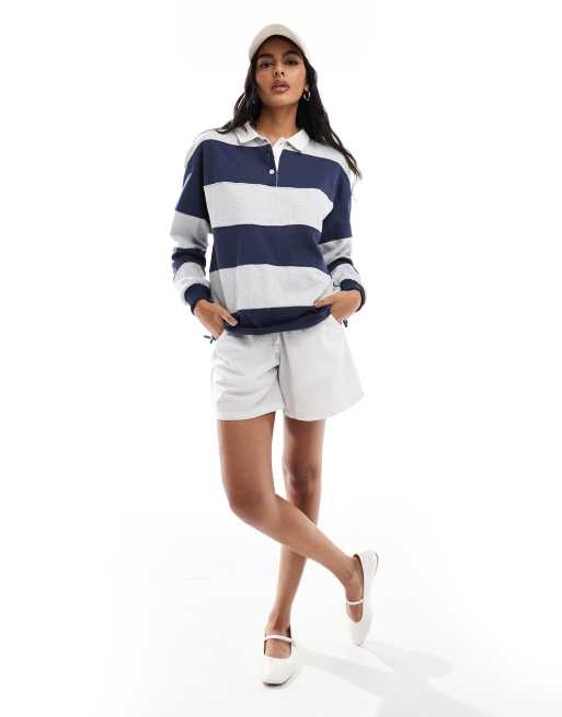 Cotton On - Polo oversize a maniche lunghe a righe grigie e blu navy