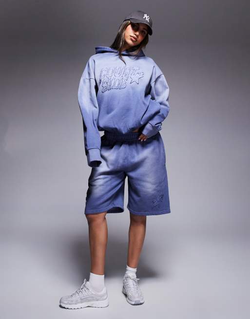 Courtside - Pantaloncini comodi blu slavato con fondo grezzo e logo in coordinato