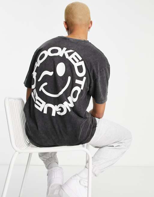 Crooked Tongues - T-shirt nero slavato con stampa con logo e smile che fa l'occhiolino