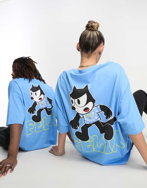 Crooked Tongues x Felix the Cat - T-shirt oversize unisex blu con grafiche stampate