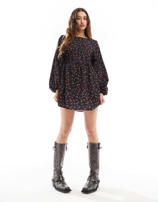Daisy Street - Vestito grembiule corto a maniche lunghe con stampa di ciliegie