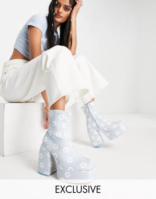 Esclusiva Daisy Street - Stivaletti con tacco e plateau blu con stampa di margherite