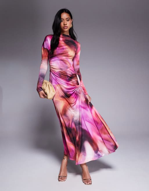 Daska - Vestito lungo drappeggiato con arricciature viola con stampa sfumata