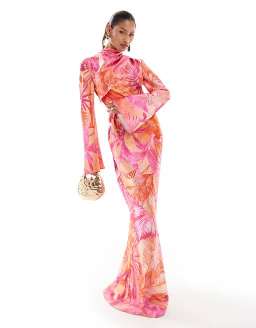 Daska - Vestito lungo in raso con stampa tropicale e maniche svasate