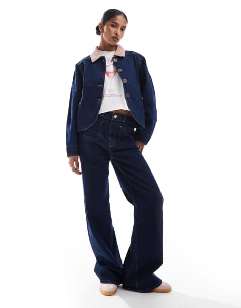 PIÙ COLORIONLY - Giacca di jeans aderente blu scuro con cuciture a contrasto