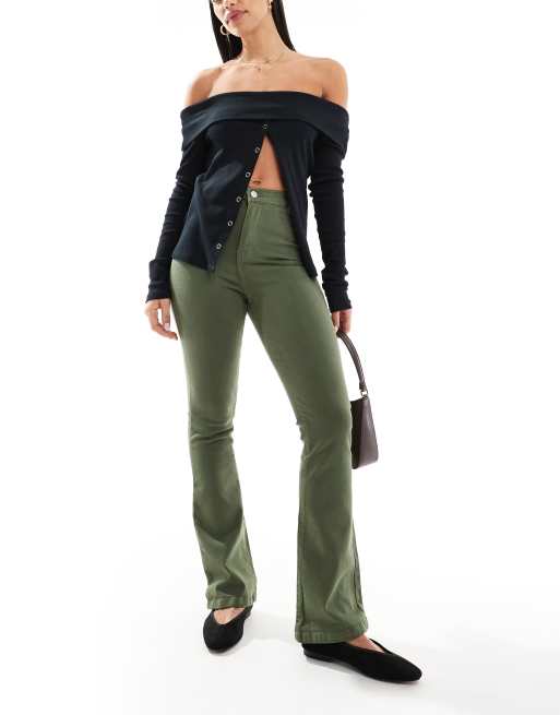 DTT - Bianca - Jeans a zampa color kaki a vita alta