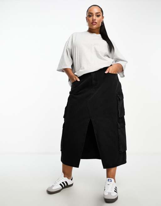 DTT Plus - Lyla - Gonna midi cargo in denim nero slavato