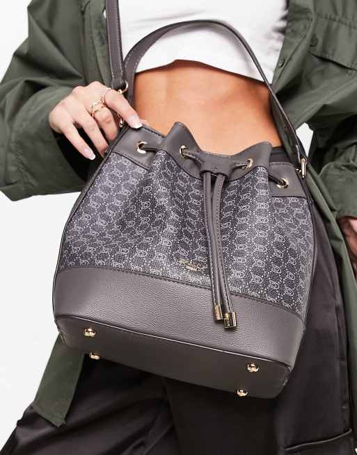 Dune - Borsa a secchiello grigia in pelle sintetica con monogramma e tracolla