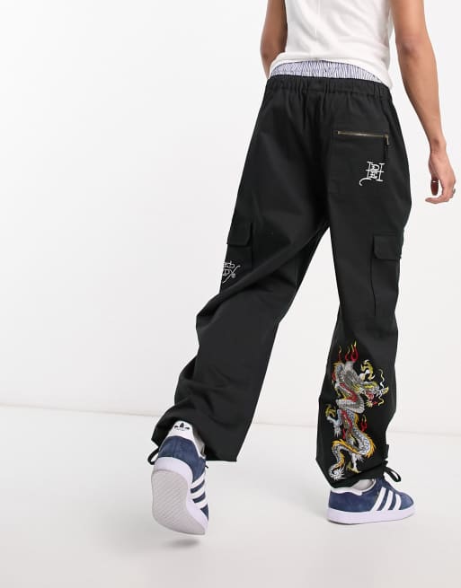Ed Hardy - Pantaloni cargo stile militare comodi neri con ricamo di drago