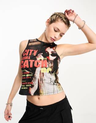Edikted - Crop top senza maniche anni '90 con stampa di ragazza e allacciatura sul retro