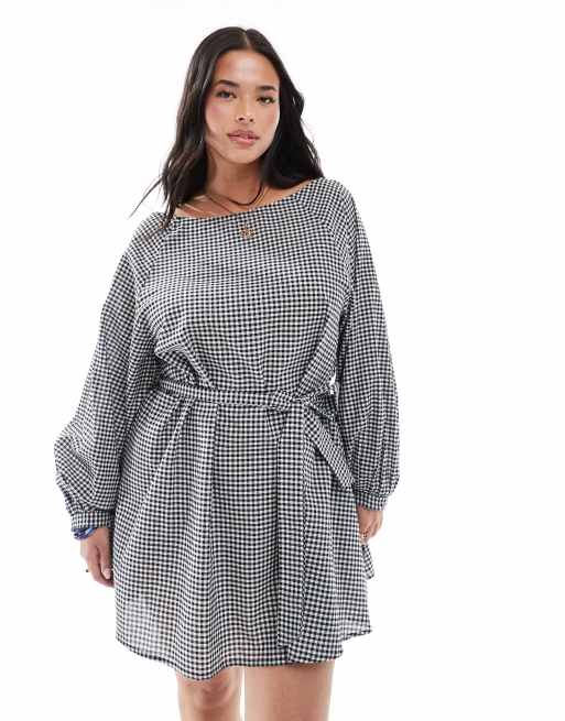 Esclusiva Esmée Curve - Vestito da mare corto nero e bianco a quadretti con maniche a tre quarti