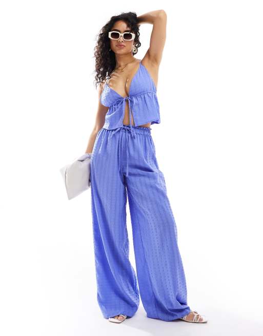 Esmee - Pantaloni da spiaggia blu a nido d'ape allacciati sul davanti in coordinato