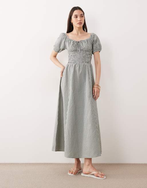 Esmée - Vestito da mare lungo verde a quadretti con maniche a sbuffo e allacciatura sul davanti