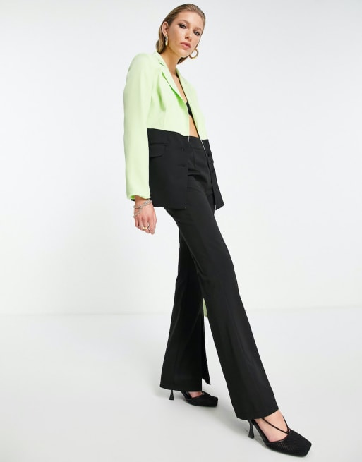 Extro & Vert - Coordinato con blazer a contrasto nero e lime e pantaloni a zampa con spacco