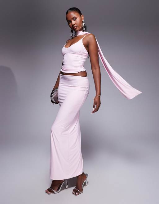 Fashionkilla - Coordinato con gonna lunga e canottiera sinuosa rosa in tessuto modellante doppio con sciarpa