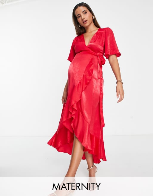 Flounce London Maternity - Vestito midi avvolgente con maniche con volant in raso rosso