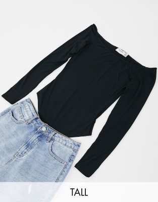 Flounce London Tall - Body basic a maniche lunghe con scollo Bardot nero