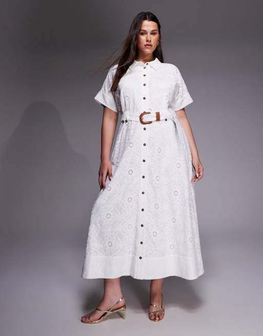 Forever New Curve - Vestito camicia midi a maniche corte in pizzo bianco