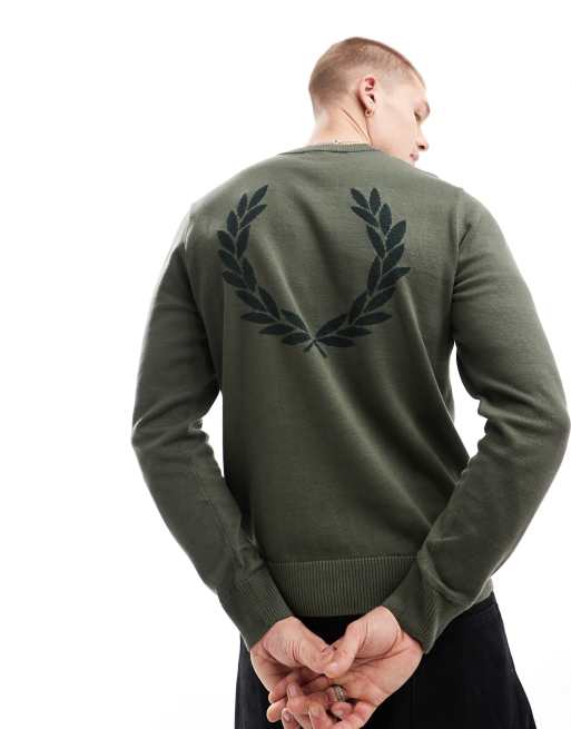 Fred Perry - Maglione verde kaki bouclé con corona d'alloro