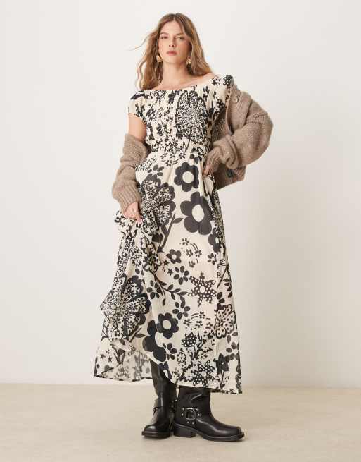 Free People - Ultraviolet - Vestito al polpaccio monocromatico con stampa a fiori e bustino arricciato