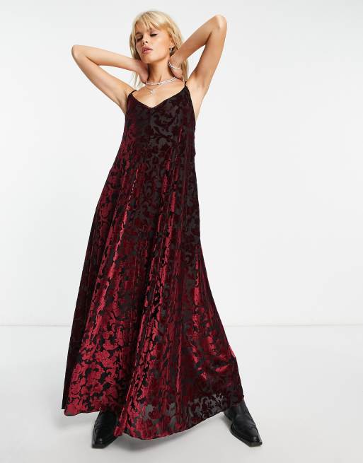 Free People - Vestito lungo con spalline sottili in velluto floccato con scollo a V rosso scuro