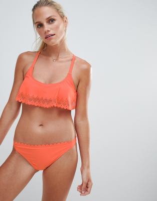 French Connection - Bikini con bordi all'uncinetto, ruches sul davanti e spalline intrecciate