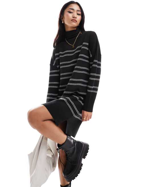French Connection - Vestito in maglia a collo alto nero a righe bianche