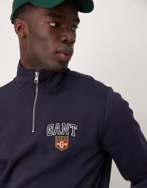 GANT - Felpa blu navy con zip corta e logo stile college