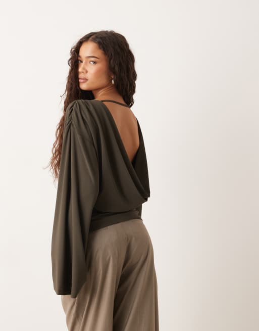 Gina Tricot - Blusa color oliva scuro con drappeggio sul retro