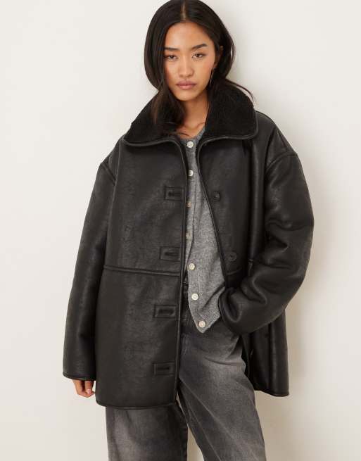 Gina Tricot - Giacca corta nera in soffice pile borg doppiata in similpelle PU