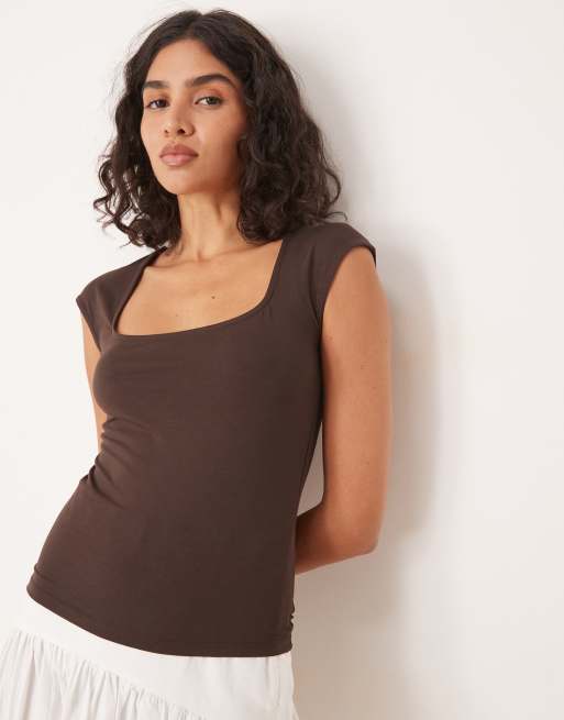 Gina Tricot - Top morbido al tatto marrone cioccolato a maniche corte con scollo rotondo ampio