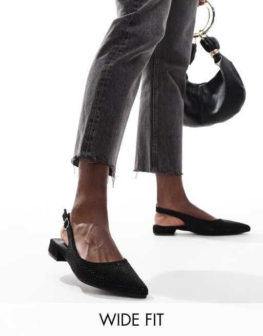 Glamorous Wide Fit - Ballerine a punta nere decorate con cinturino posteriore