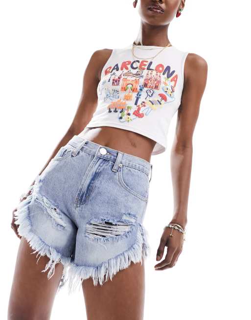 Glamorous - Pantaloncini di jeans con fondo asimmetrico lavaggio acido effetto invecchiato