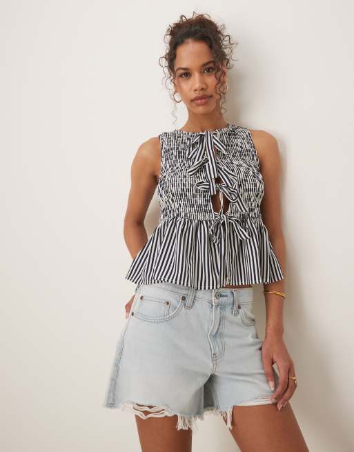 Glamorous - Top arricciato blu navy e bianco a righe con peplo e fiocchi sul davanti