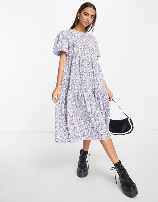 Glamorous - Vestito grembiule midi a pieghe blu a fiori allacciato sul retro