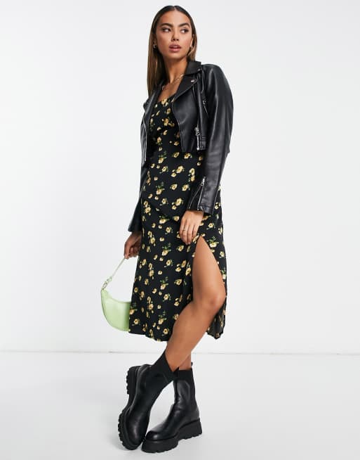 Glamorous - Vestito milkmaid midi nero e giallo a fiorellini con maniche a sbuffo