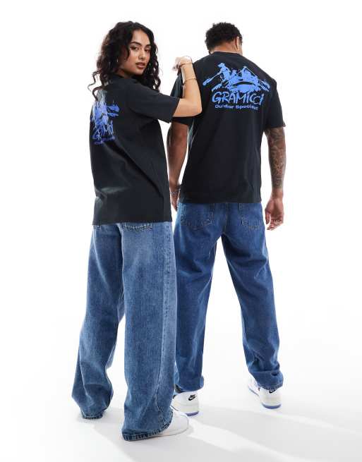 Gramicci - T-shirt unisex in cotone nera con grafica di canoe