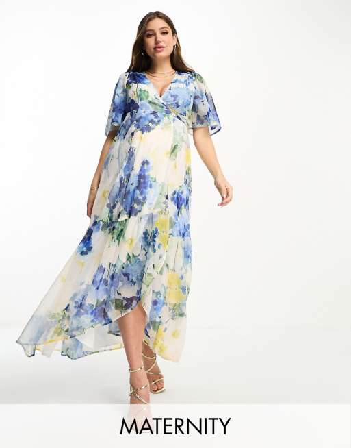 Hope & Ivy Maternity - Vestito lungo avvolgente con volant a fiori blu