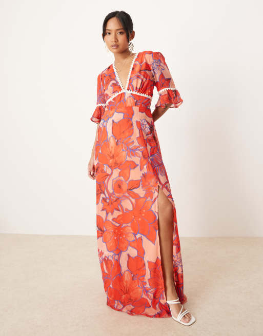 Hope & Ivy Petite - Vestito lungo con stampa corallo, apertura a goccia sul retro e volant sulle maniche