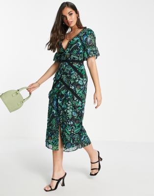 Hope & Ivy - Vestito da giorno midi blu e verde a fiori con pizzo a contrasto