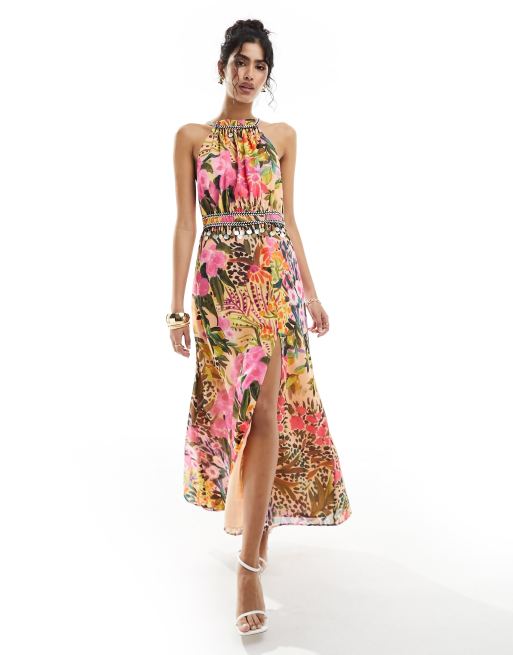 Hope & Ivy - Vestito lungo accollato kaki a fiori con spacco sulla coscia