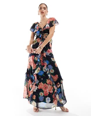 Hope & Ivy - Vestito lungo blu navy a fiori con finiture in pizzo e apertura a goccia