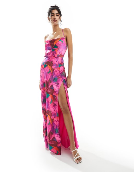 Hope & Ivy - Vestito lungo con spalline sottili e spacco sulla coscia in raso rosa a fiori